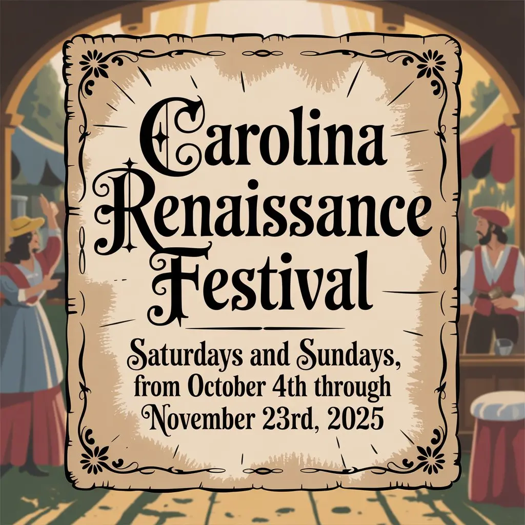 The Carolina Renaissance Festival 2025 returns to Huntersville, North Carolina, running every Saturday and Sunday from October 4th through November 23rd, 2025. Gates open daily at 9:30 a.m. and close at 5:30 p.m., with a lively pre-opening show starting at 9:05 a.m. Tickets are available online here.