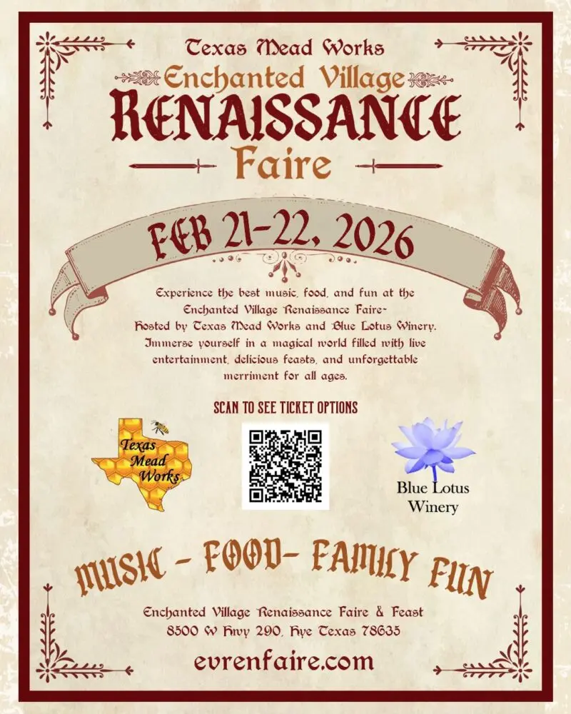 Get ready to step into another realm of fantasy, fire, and fun at the 2nd Annual Enchanted Village Renaissance Faire, happening February 21–22, 2026, in the small town of Hye, Texas. This isn’t your average winter weekend—expect costumes, clashing swords, swirling dances, and mead flowing like magic.